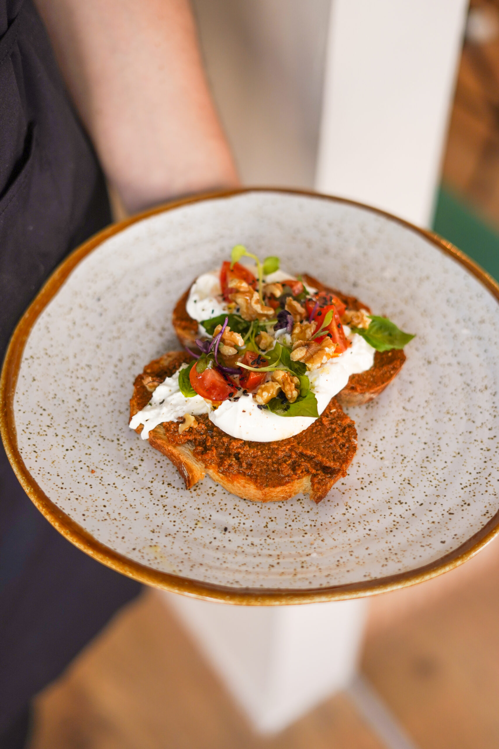 Burrata cremosa sobre pan de masa madre con pesto rojo, tomates cherry y polvo de frutos secos.