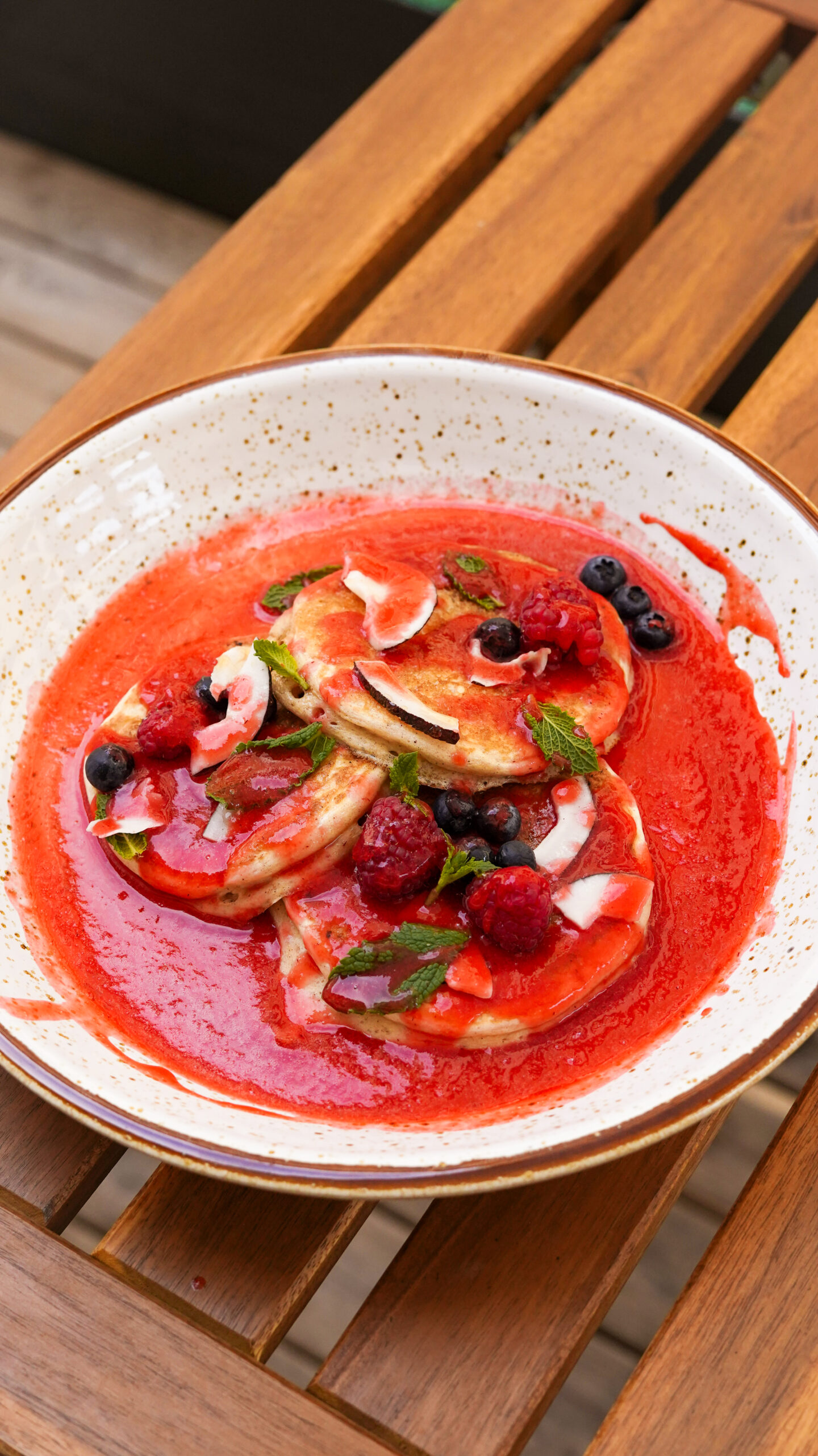 Pancakes aireados sin azúcar añadido, servidos con sopa de fresas fresca, escama de coco, frutos rojos y perfume de miel.