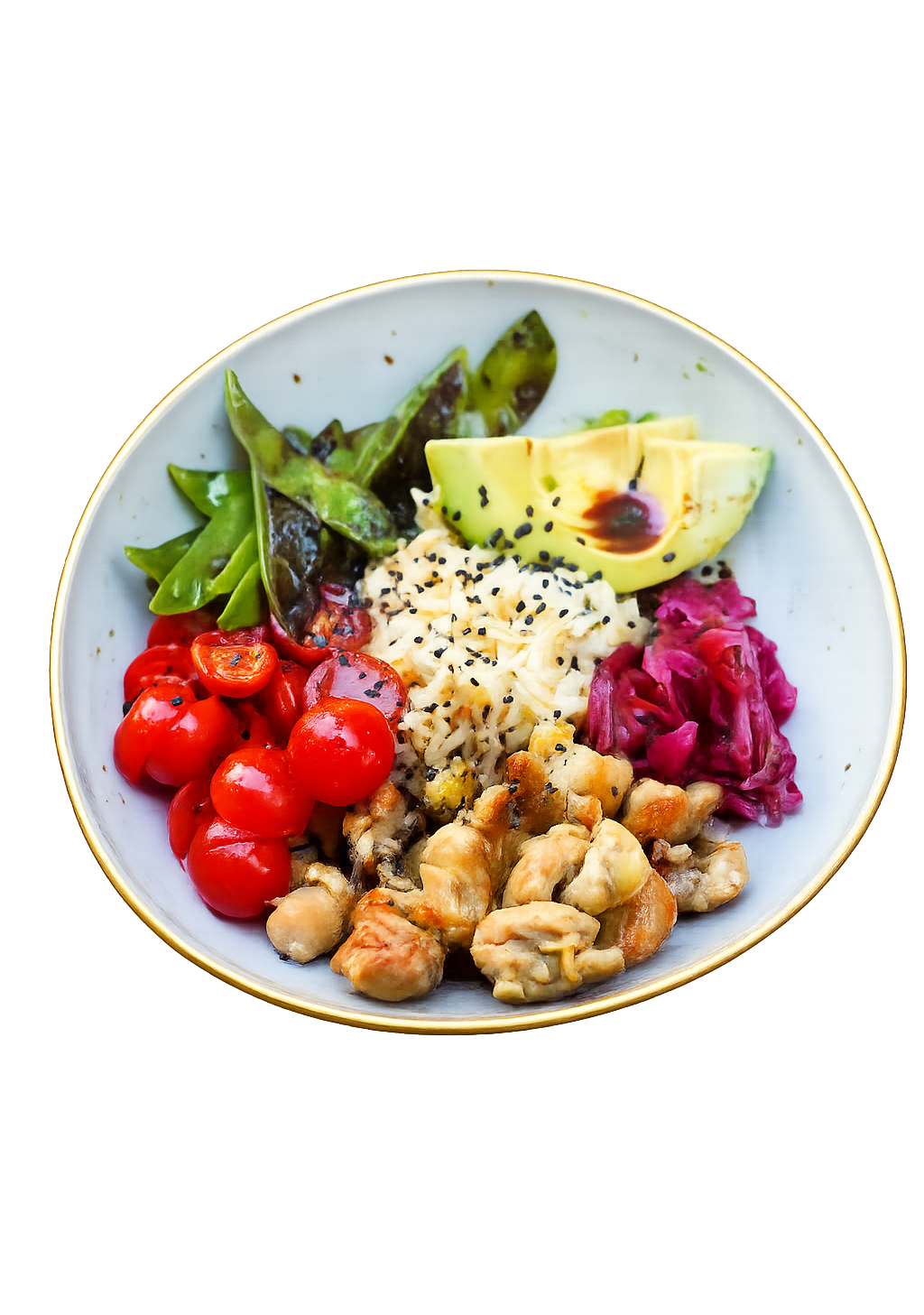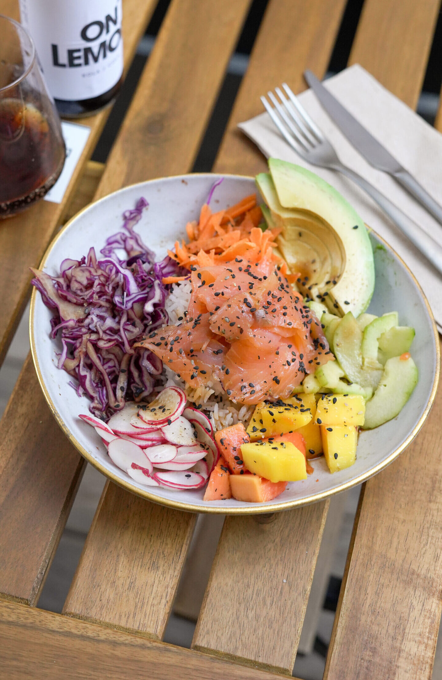 Arroz Jazmin con salmón ahumado, mango, papaya, aguacate y verduras frescas.