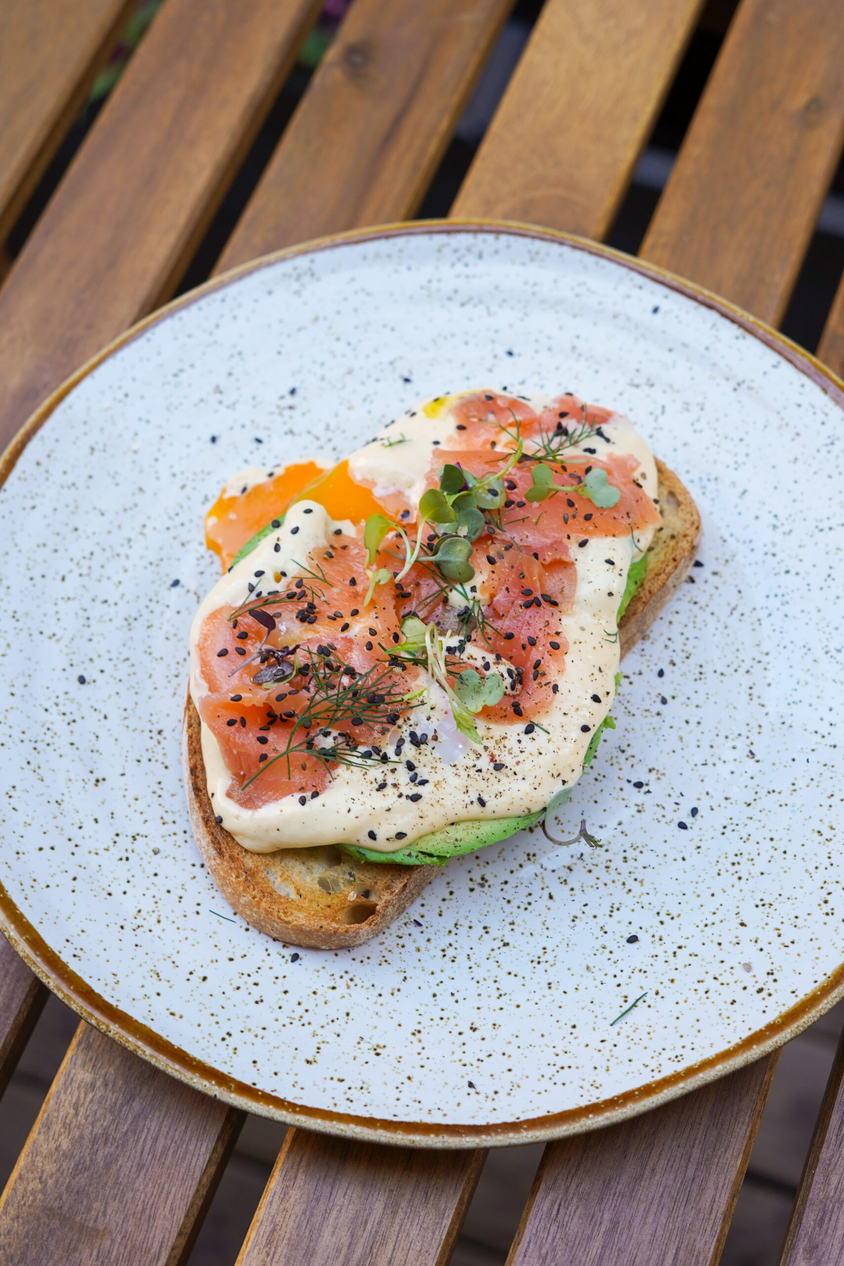 Pan de masa madre, huevos cocinados a baja temperatura, aguacate, salmón, holandesa ligera y hierbitas frescas.